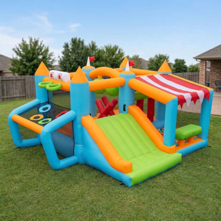 Ta edinstveni športni adrenalniski napihljiv grad je pravi poligon za aktivne otroke, ki združuje boxing ovire, tobogan, košarkarsko obroč, nogometni gol in bazen z barvitimi žogicami. Napihljiva igrala Adrenalinski Grad so idealna izbira za športne rojstnodnevne zabave in otroke, ki obožujejo akcijo. To večfunkcionalno igralo po ugodni ceni (samo 70€/dan) je popolno za otroke od 3 let naprej, ki želijo premagati ovire in se preizkusiti v različnih športnih izziv ih.